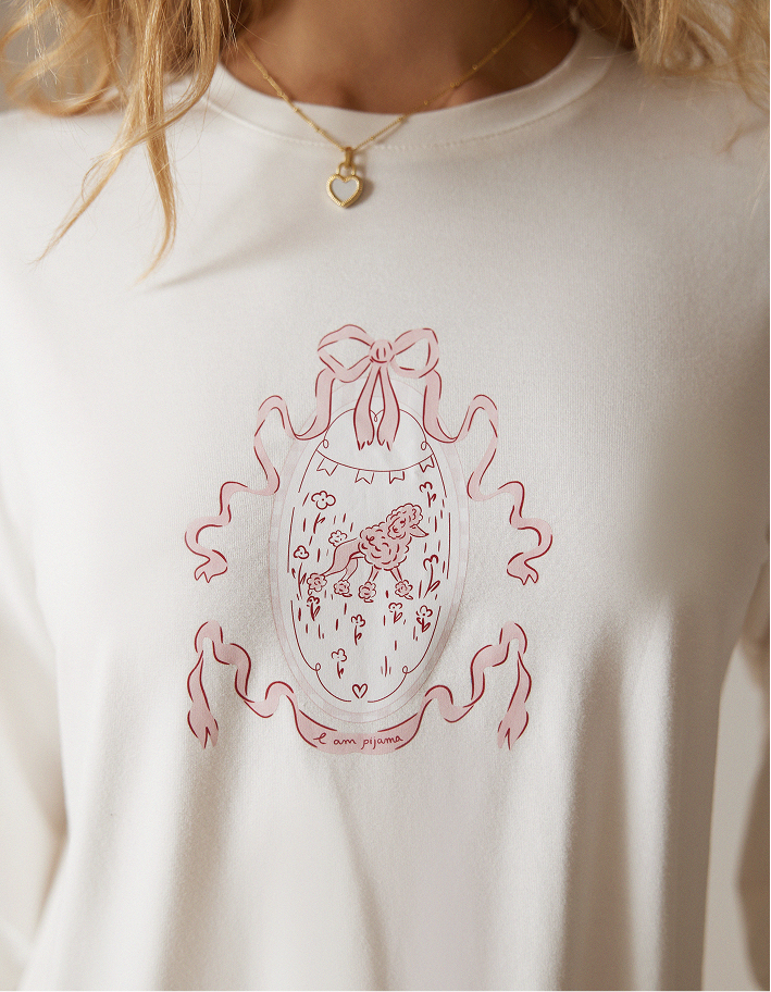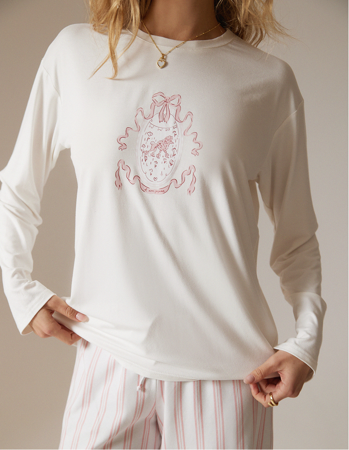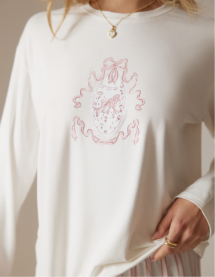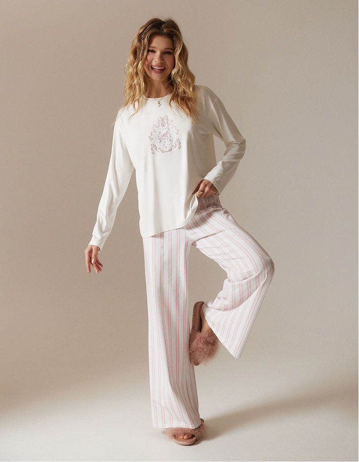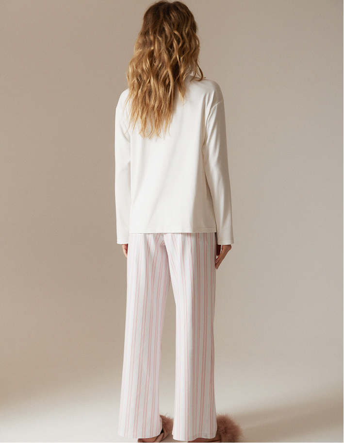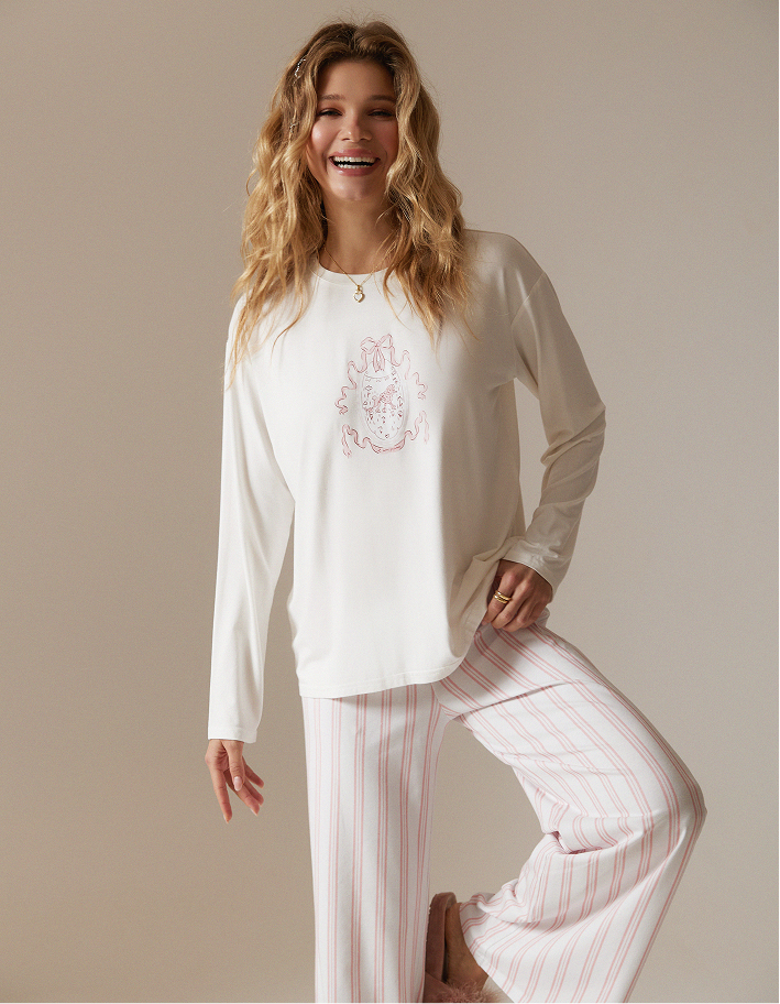 Нежный и по-домашнему уютный пижамный комплект: лонгслив свободного кроя и прямые брюки с комфортной посадкой. Верх в молочном оттенке с аккуратным принтом смотрится лаконично и мягко, а лёгкие брюки в бело-розовую вертикальную полоску визуально вытягивают силуэт и добавляют образу свежести.