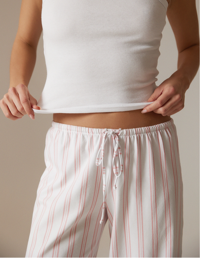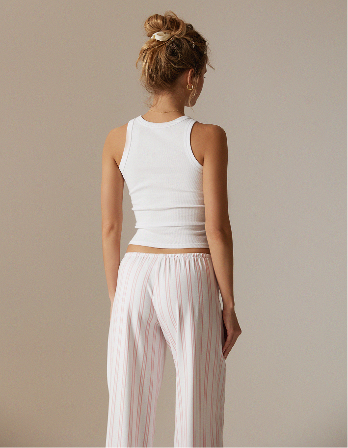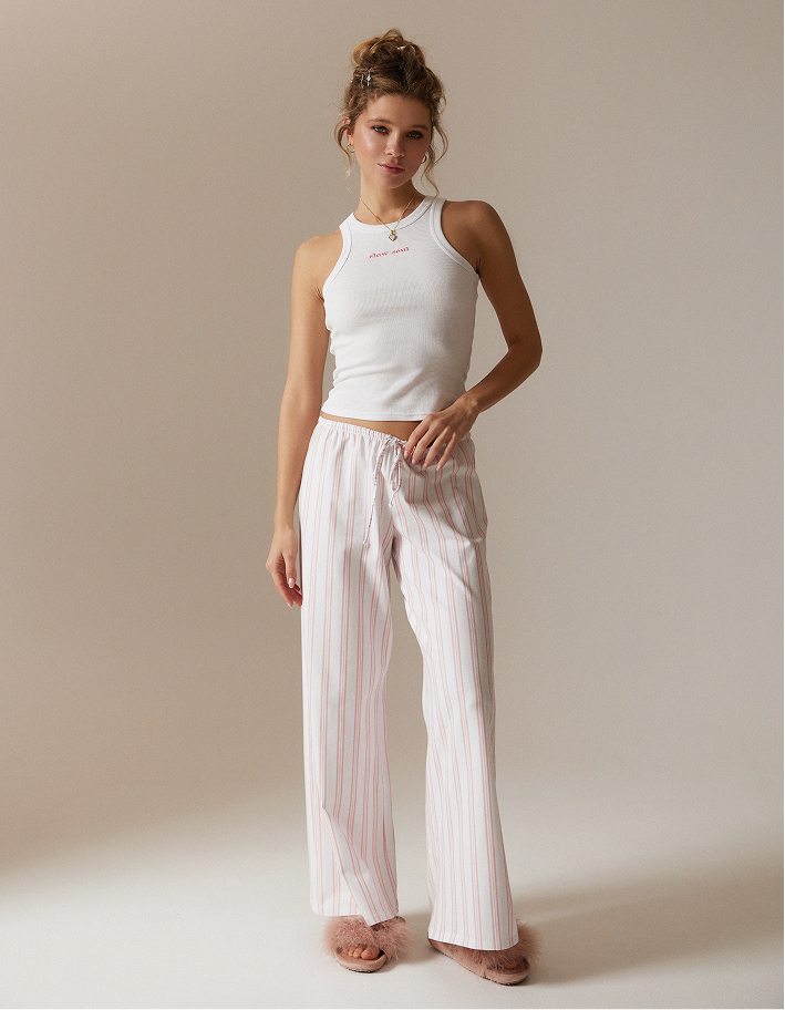 Свежий и расслабленный пижамный комплект в минималистичном стиле: белый топ-майка с аккуратной посадкой и свободные прямые брюки на кулиске. Верх выполнен из мягкого трикотажа, который комфортно прилегает к телу и отлично подходит для сна и домашнего отдыха. Брюки из лёгкой ткани с вертикальной нежно-розовой полоской визуально вытягивают силуэт и дарят ощущение простора — удобно двигаться, сидеть и отдыхать. Белоснежная база и деликатный полосатый принт создают чистый, «утренний» образ: спокойный, уютный и при этом стильный. Идеальный вариант для домашних завтраков, выходных и неспешных вечеров.