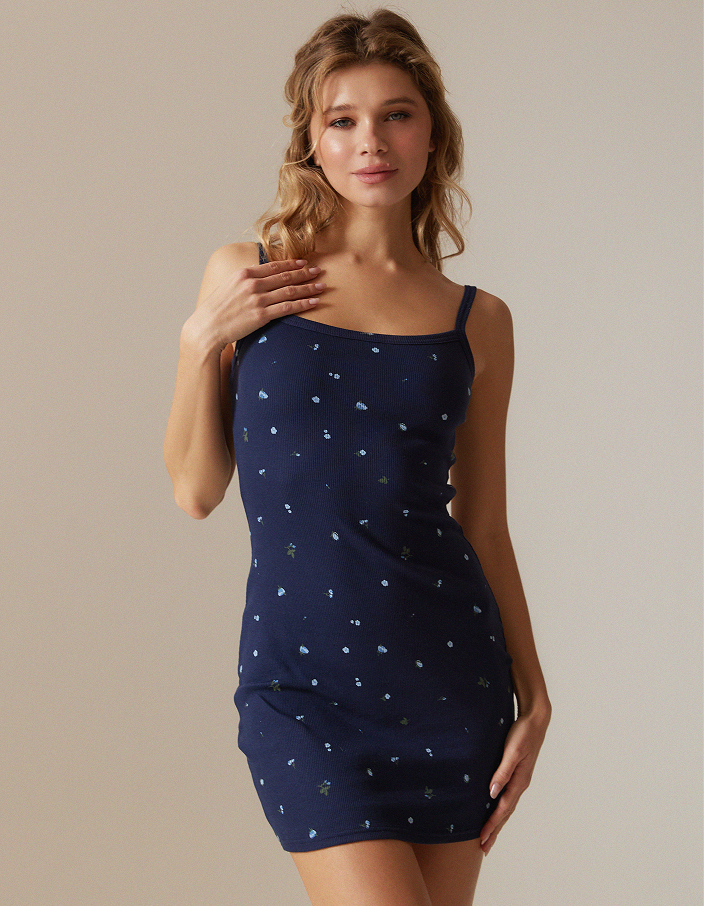 Ночная сорочка из хлопкового трикотажа с эластаном — мягкая, эластичная и комфортная в движении. Прилегающий силуэт на тонких бретелях подчёркивает фигуру, не утягивая и не стесняя. Тёмно-синий цвет и мелкий принт смотрятся аккуратно и немного кокетливо. Выбор для тех, кто любит чувствовать себя собранно и красиво даже дома.